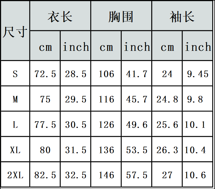 【特别说明】此尺码数据在衣服平铺下测量所得,因测量方法不同,误差在1-3cm内的属于正常现象