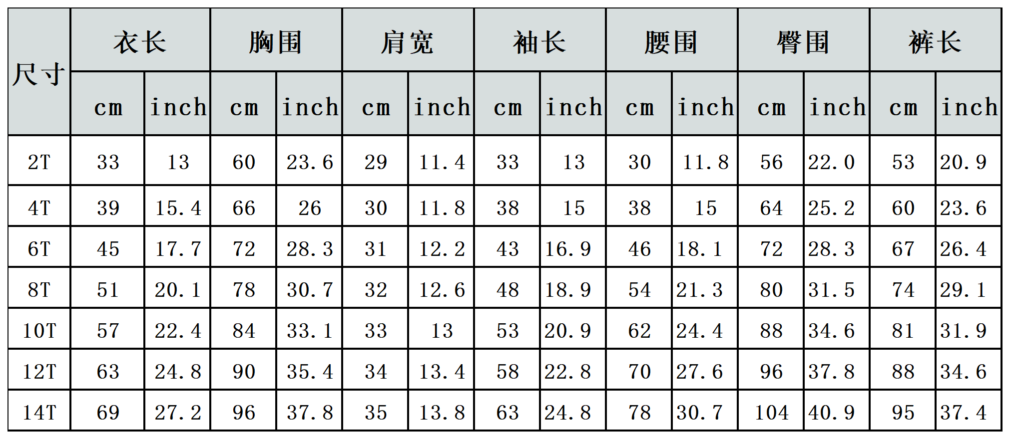 【特别说明】此尺码数据在衣服平铺下测量所得,因测量方法不同,误差在1-3cm内的属于正常现象