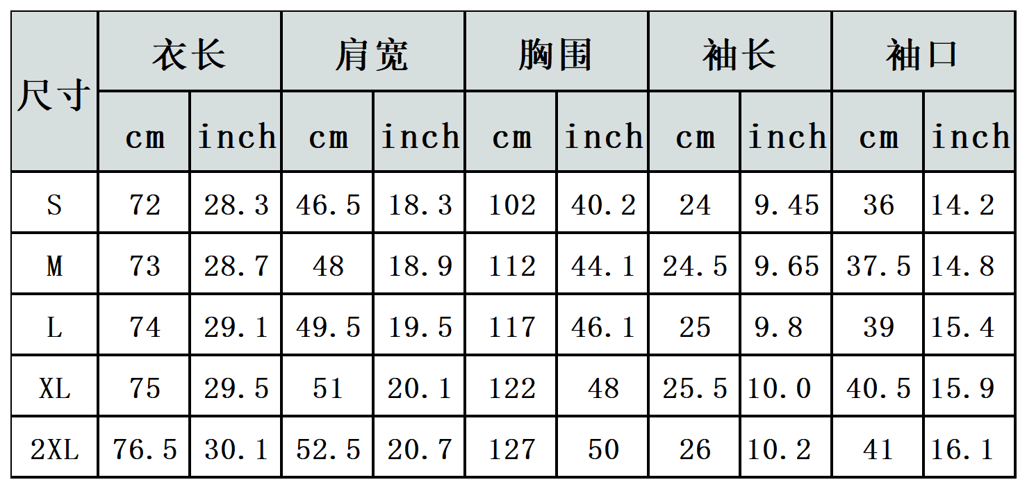 【特别说明】此尺码数据在衣服平铺下测量所得,因测量方法不同,误差在1-3cm内的属于正常现象