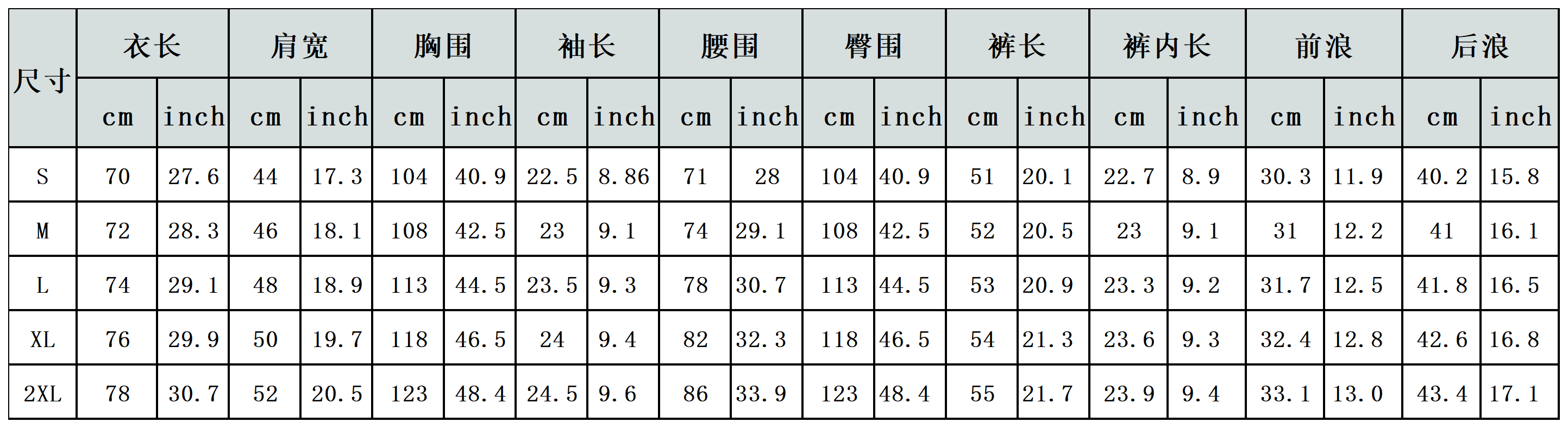 【特别说明】 此尺码数据在衣服平铺下测量所得,因测量方法不同,误差在1-3cm内的属于正常现象