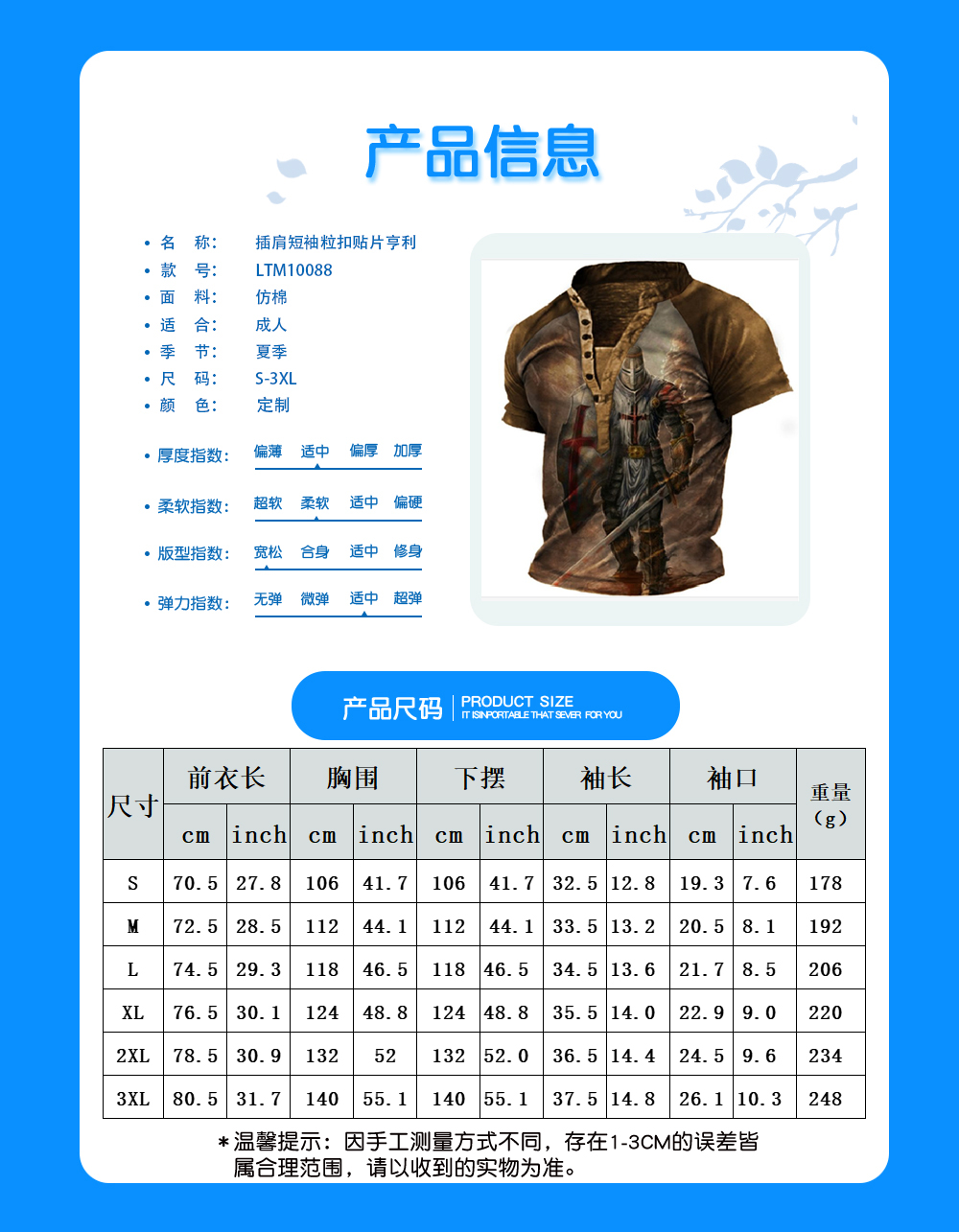 中文名称:插肩短袖6粒扣亨利衫英文名称:产品货号:LTM10088生产工艺: 满印印花产品材质: 涤纶(Polyester)