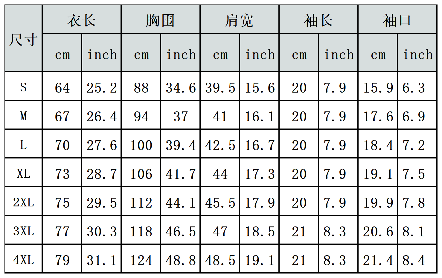 【特别说明】此尺码数据在衣服平铺下测量所得,因测量方法不同,误差在1-3cm内的属于正常现象