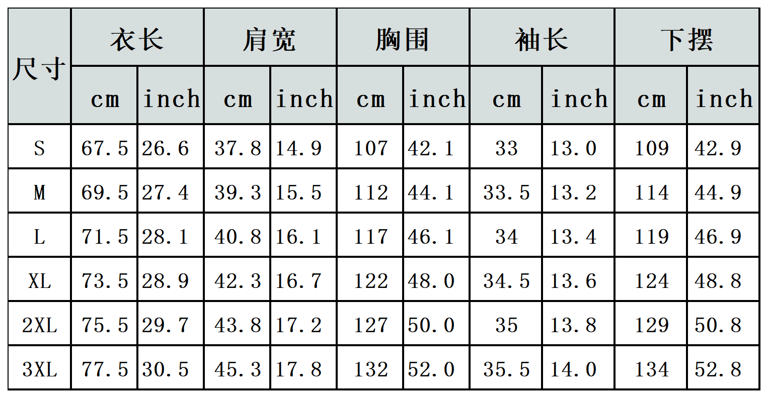 【特别说明】此尺码数据在衣服平铺下测量所得,因测量方法不同,误差在1-3cm内的属于正常现象