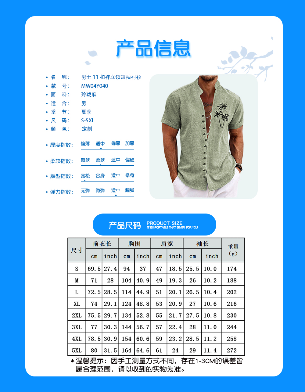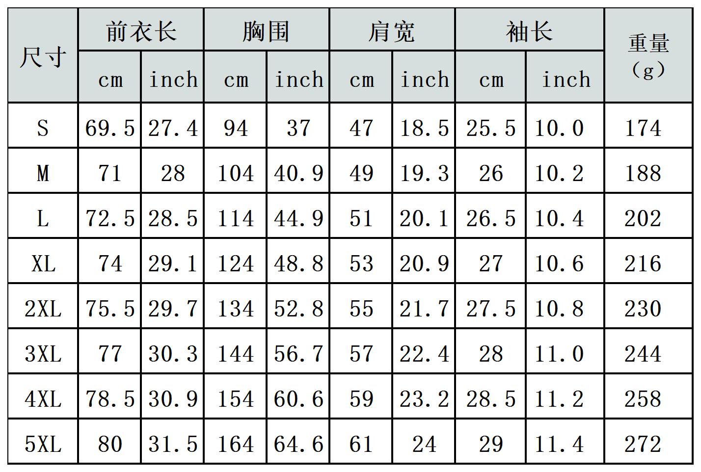 【特别说明】此尺码数据在衣服平铺下测量所得,因测量方法不同,误差在1-3cm内的属于正常现象