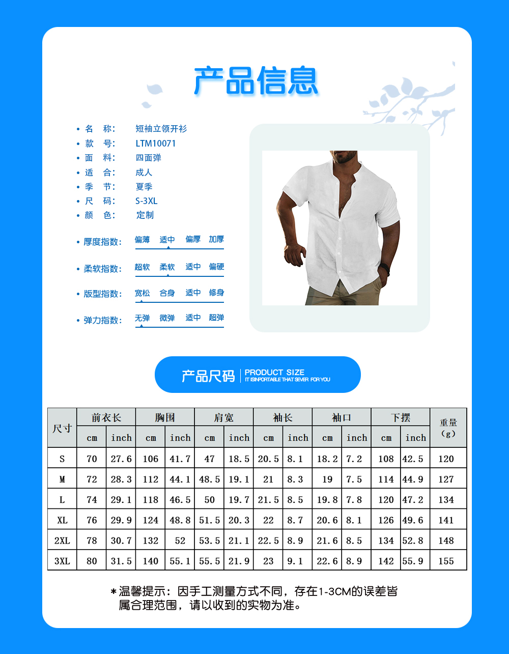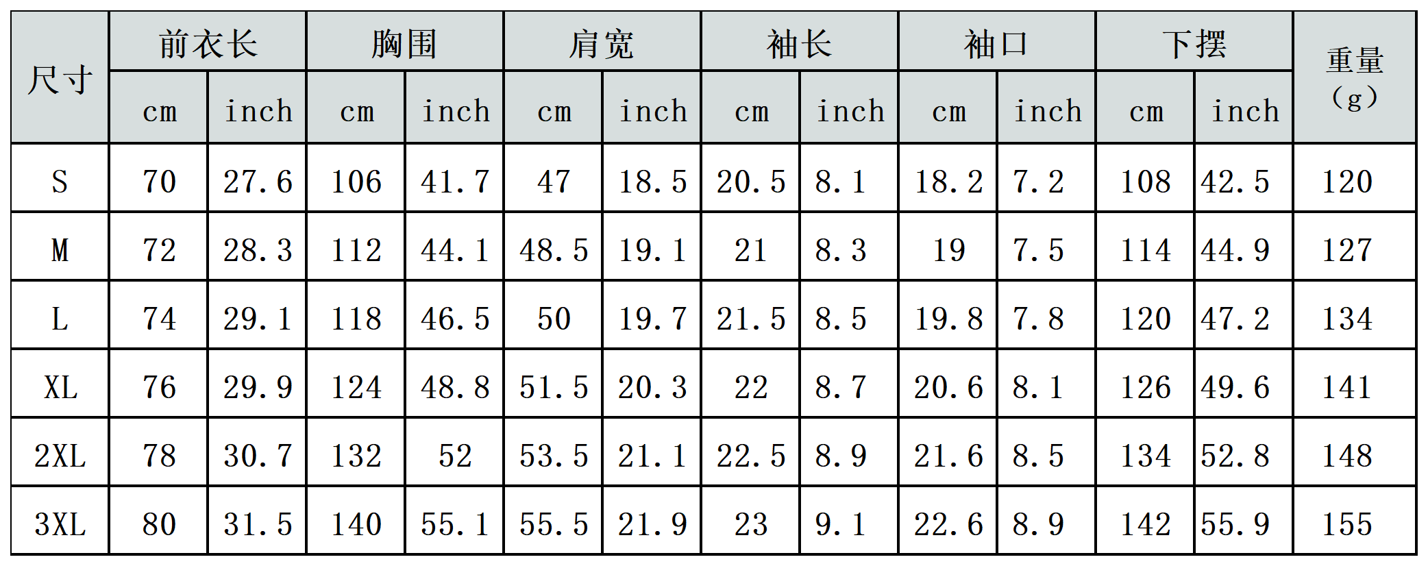 【特别说明】此尺码数据在衣服平铺下测量所得,因测量方法不同,误差在1-3cm内的属于正常现象