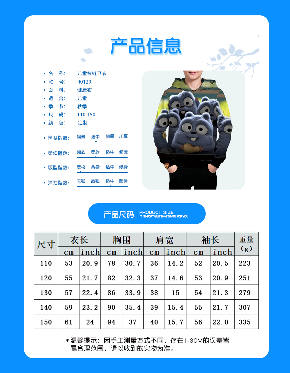 中文名称:儿童单层连帽拉链衫英文名称:产品货号:R0129生产工艺: 满印印花产品材质: 健康布