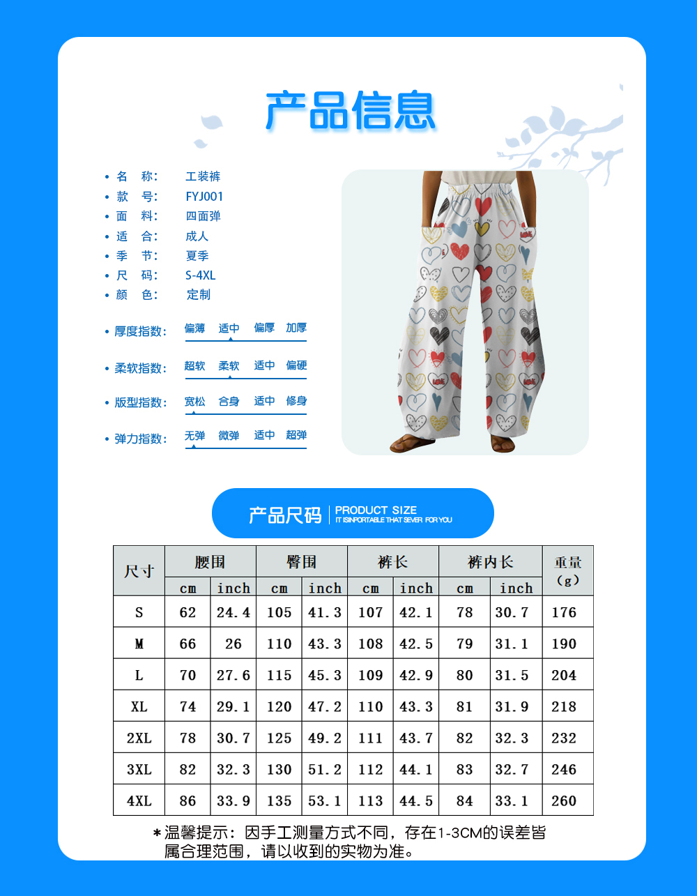中文名称:工装裤 英文名称:产品货号:FYJ003生产工艺: 满印印花产品材质:四面弹