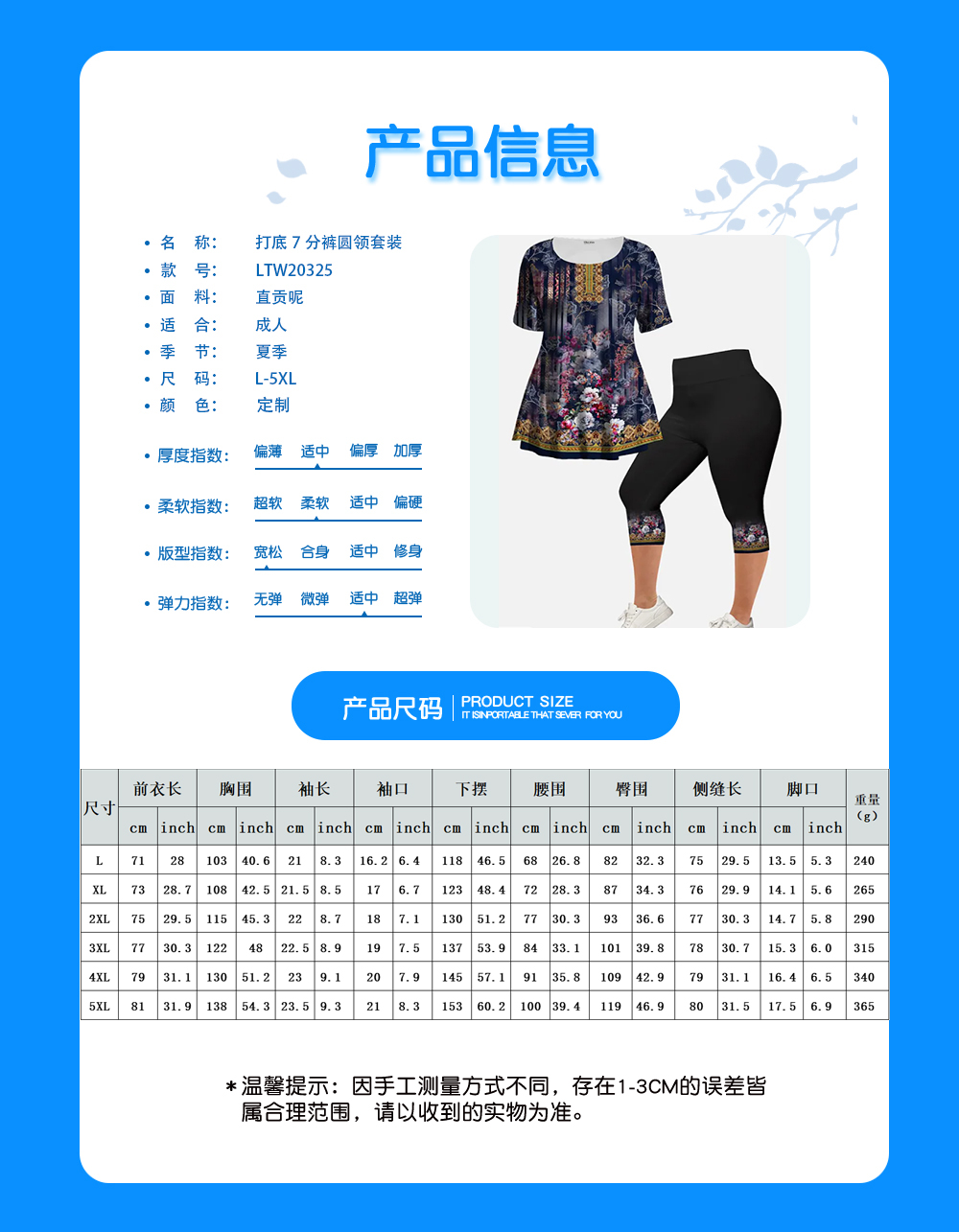 中文名称:女士打底7分裤圆领套装英文名称:产品货号:LTW20325生产工艺: 满印印花产品材质: 涤纶(Polyester)