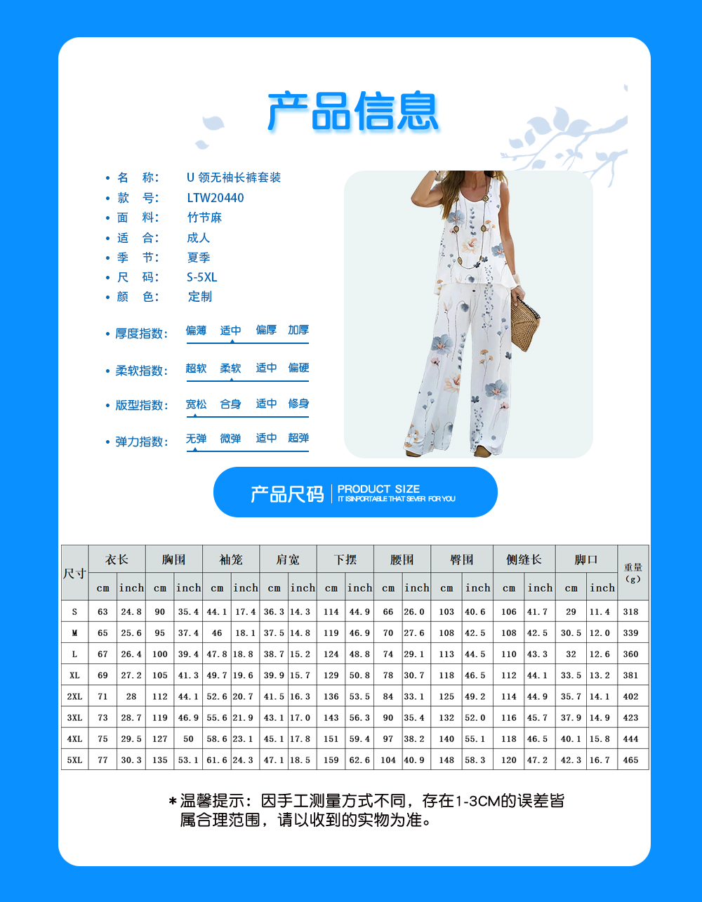 中文名称:U领无袖长裤套装英文名称:产品货号:LTW20440生产工艺: 满印印花产品材质: 竹节麻