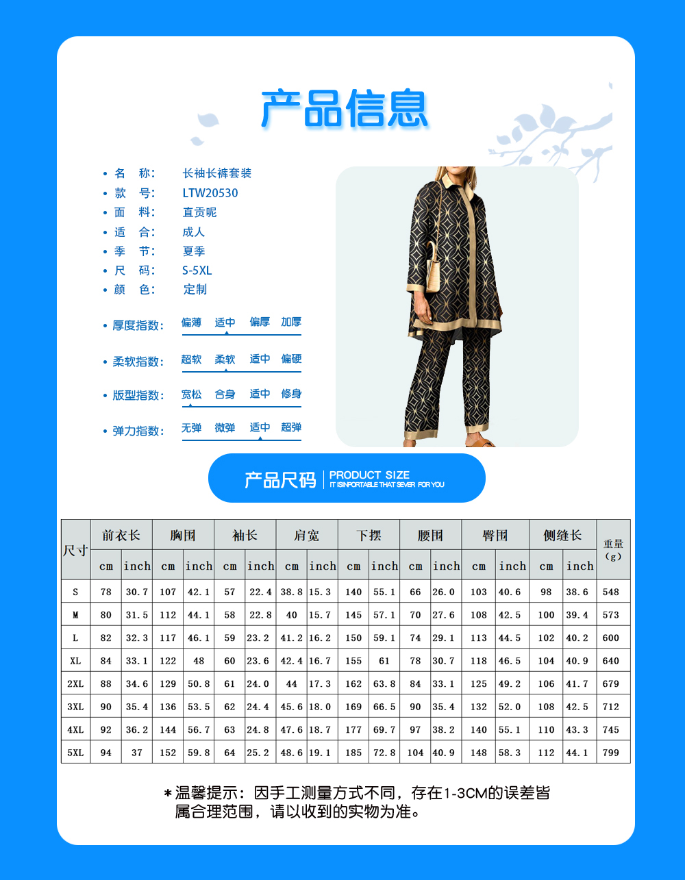 中文名称:长袖长裤套装英文名称:产品货号:LTW20530生产工艺: 满印印花产品材质: 直贡呢