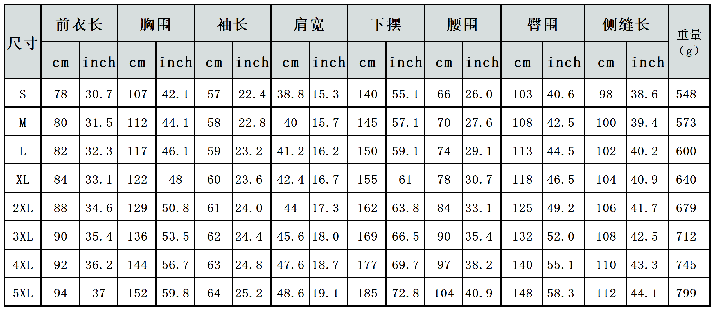 【特别说明】此尺码数据在衣服平铺下测量所得,因测量方法不同,误差在1-3cm内的属于正常现象