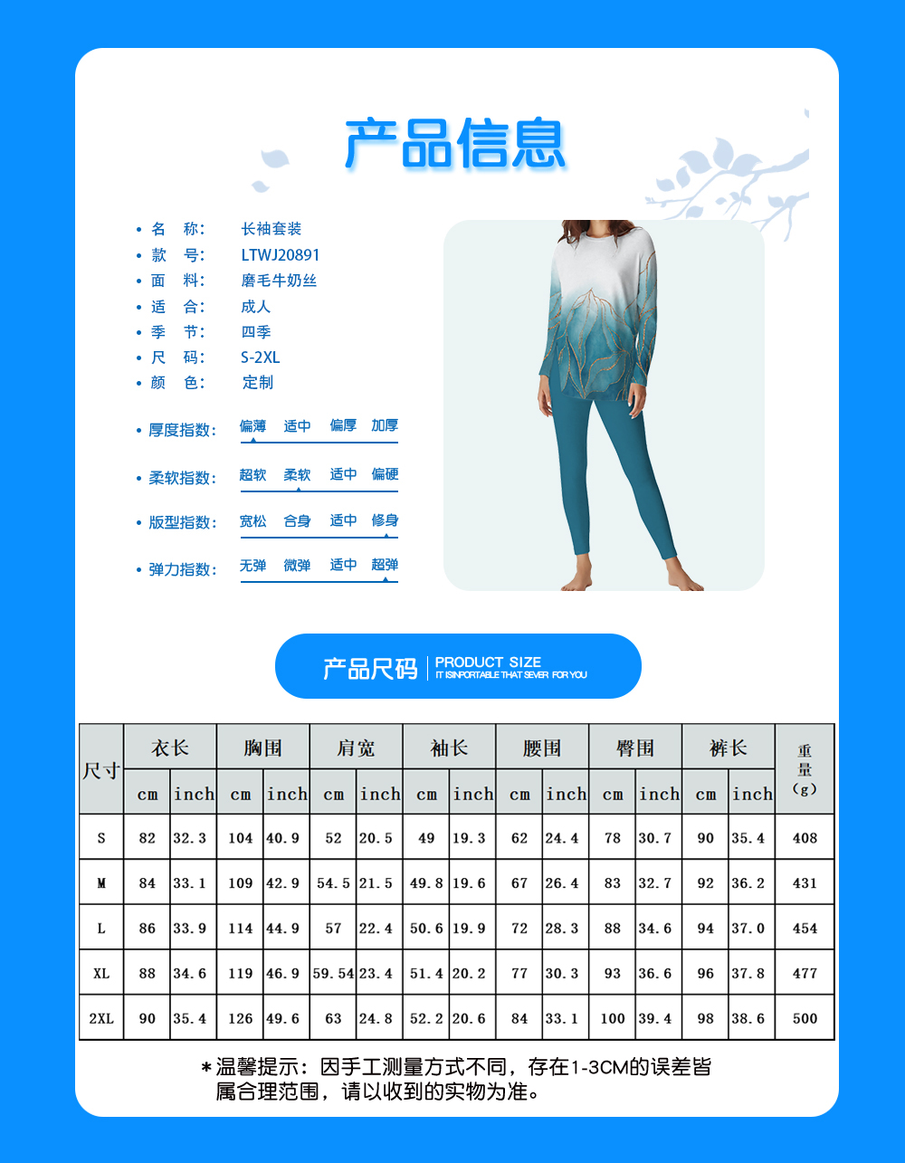 中文名称:女士长袖套装英文名称:产品货号:LTWJ20891生产工艺: 满印印花产品材质: 磨毛牛奶丝