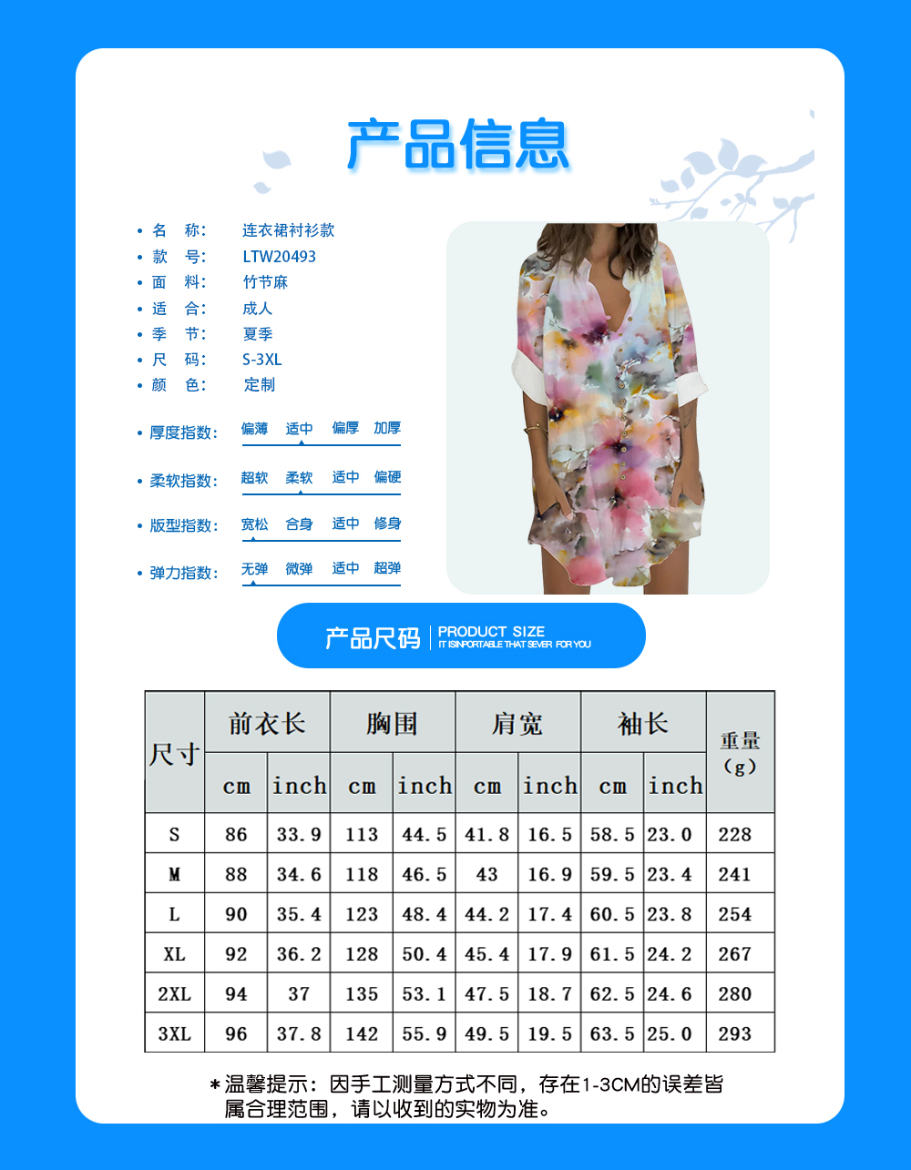 中文名称:连衣裙衬衫款英文名称:产品货号:LTW20493生产工艺: 满印印花产品材质: 涤纶(Polyester)
