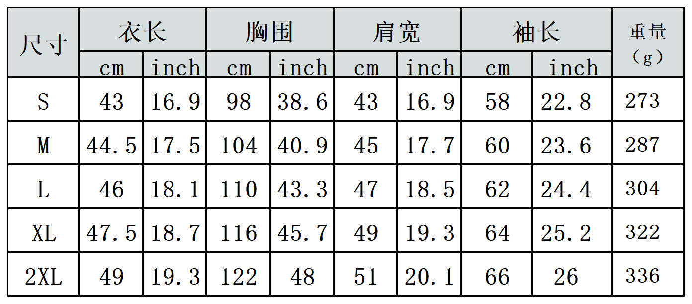 【特别说明】 此尺码数据在衣服平铺下测量所得,因测量方法不同,误差在1-3cm内的属于正常现象