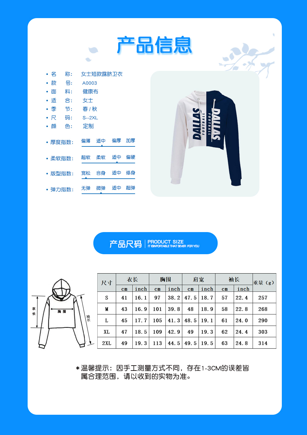 文名称: 3D 女士短款露脐卫衣 英文名称: Women's short crop hoodie 产品编号:A0003生产工艺: 满印印花产品材质:220g空气层