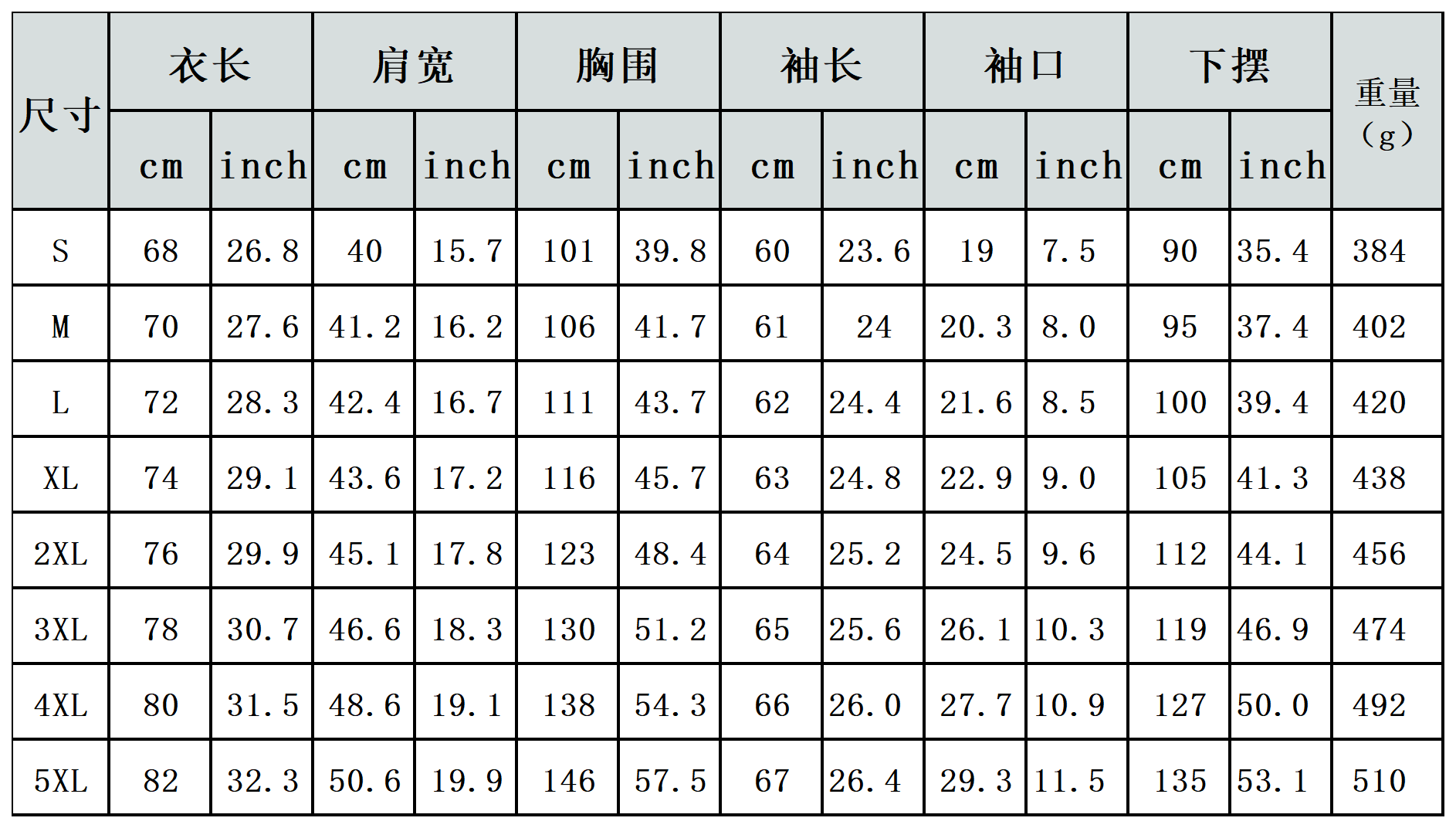 【特别说明】此尺码数据在衣服平铺下测量所得,因测量方法不同,误差在1-3cm内的属于正常现象。