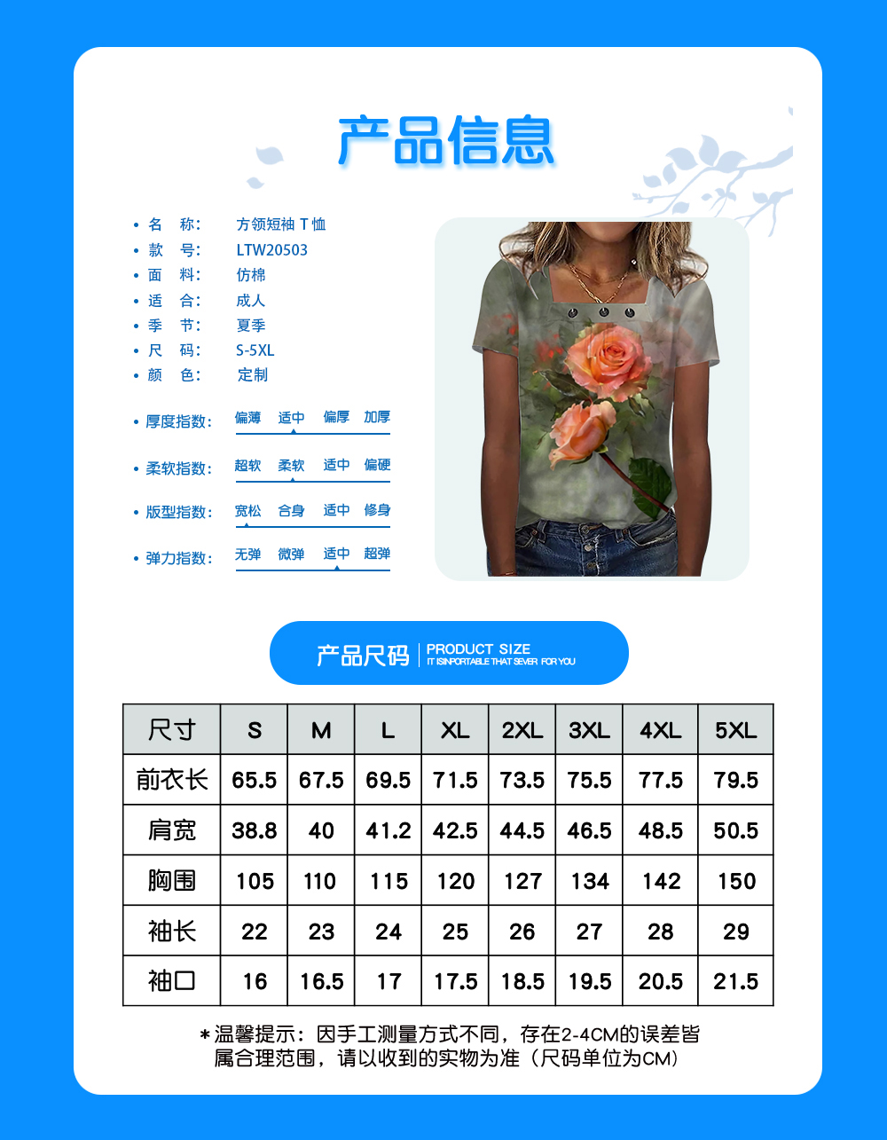 中文名称:方领短袖T恤英文名称:产品货号:LTW20503生产工艺: 满印印花产品材质: 涤纶(Polyester)