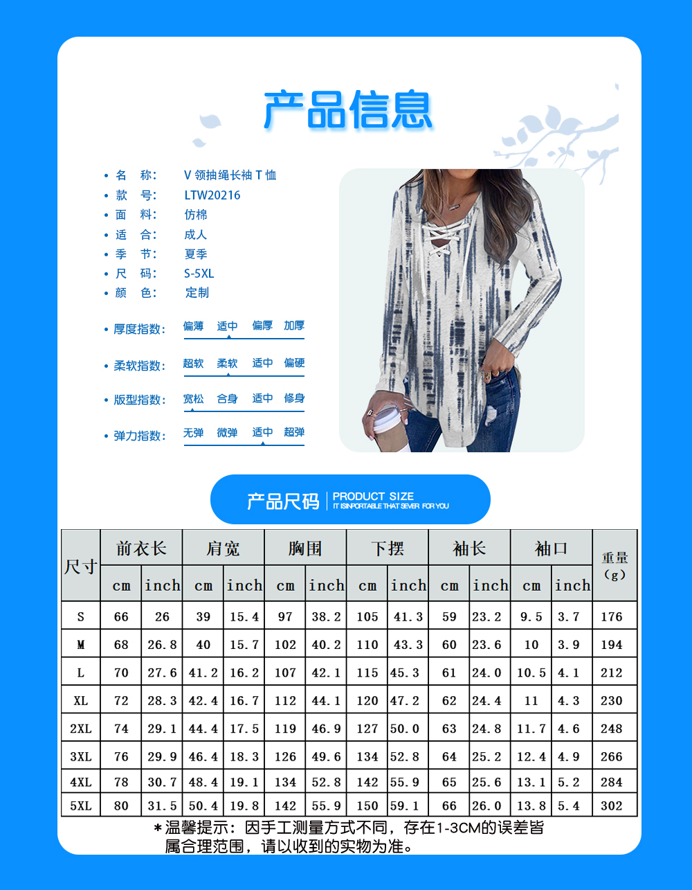 中文名称:V领抽绳长袖T恤英文名称:产品货号:LTW20216生产工艺: 满印印花产品材质: 仿棉