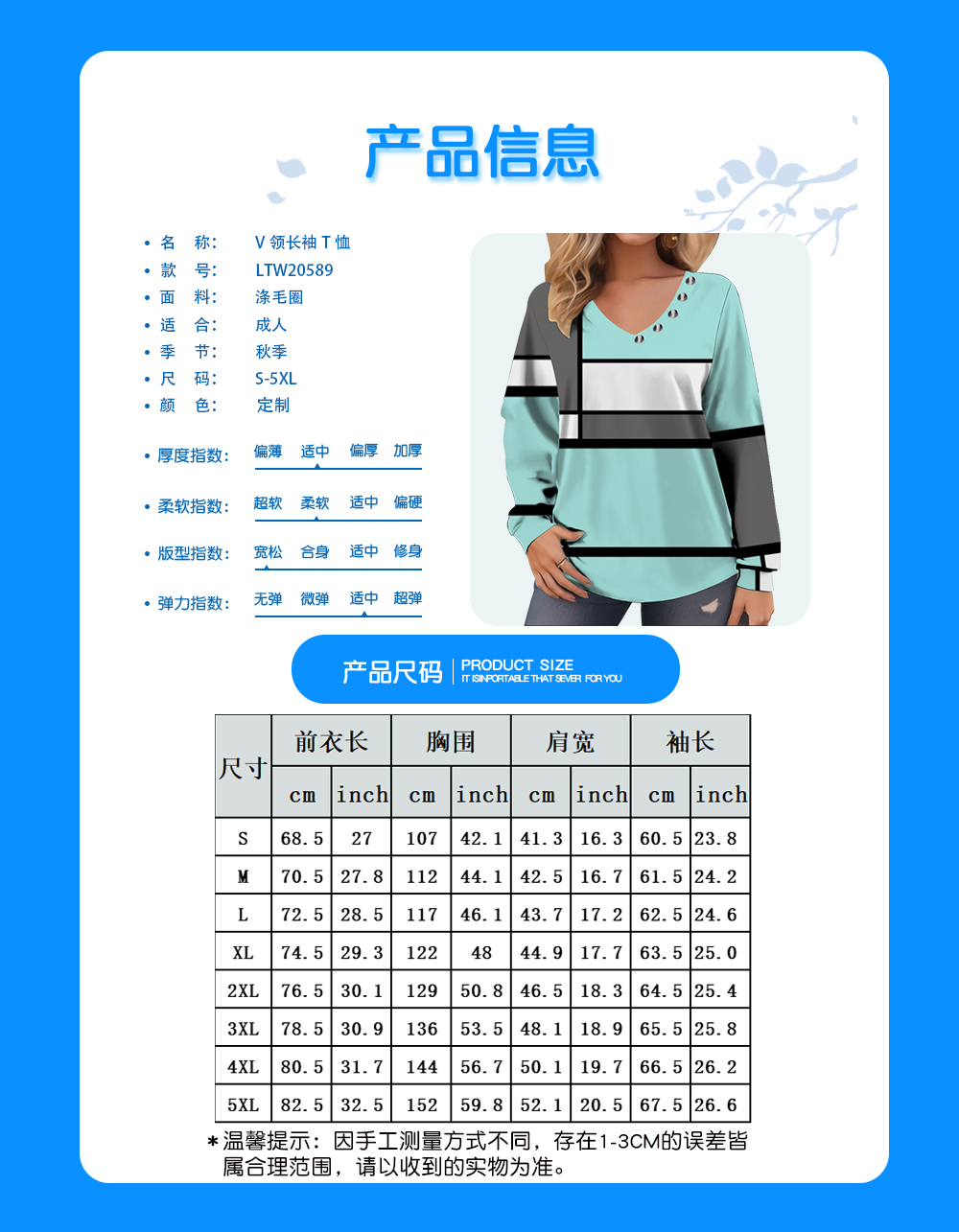中文名称: V领长袖英文名称:产品编号:LTW20589产工艺: 满印印花产品材质: 仿棉