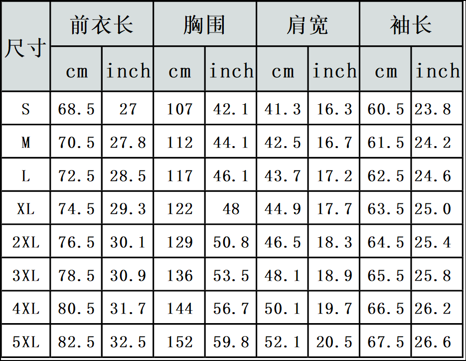 【特别说明】此尺码数据在衣服平铺下测量所得,因测量方法不同,误差在1-3cm内的属于正常现象
