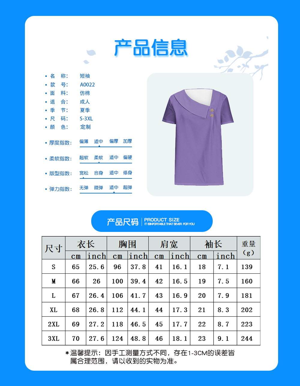 中文名称: 歪领短袖上衣英文名称:产品编号:A0022产工艺: 满印印花产品材质: 仿棉