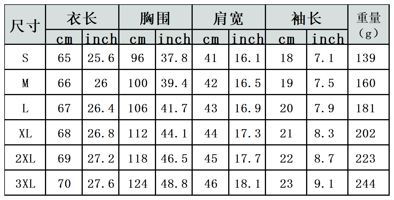 【特别说明】此尺码数据在衣服平铺下测量所得,因测量方法不同,误差在1-3cm内的属于正常现象
