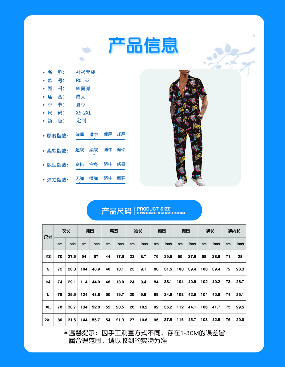 中文名称:衬衫套装英文名称:产品货号:R0152生产工艺: 满印印花产品材质: 四面弹