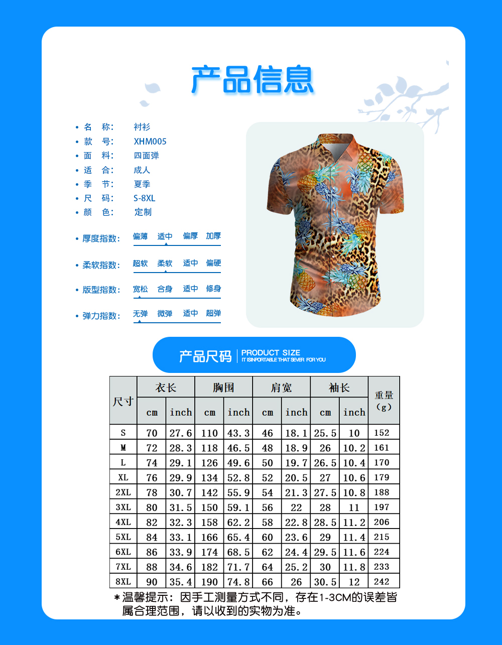 中文名称:衬衫英文名称:产品货号:XHM005生产工艺: 满印印花产品材质: 四面弹