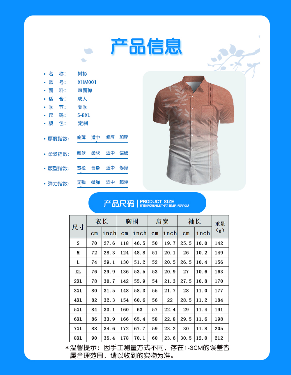 中文名称:衬衫英文名称:产品货号:XHM001生产工艺: 满印印花产品材质: 四面弹