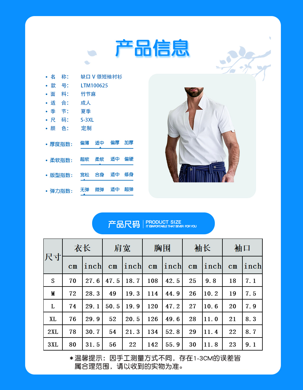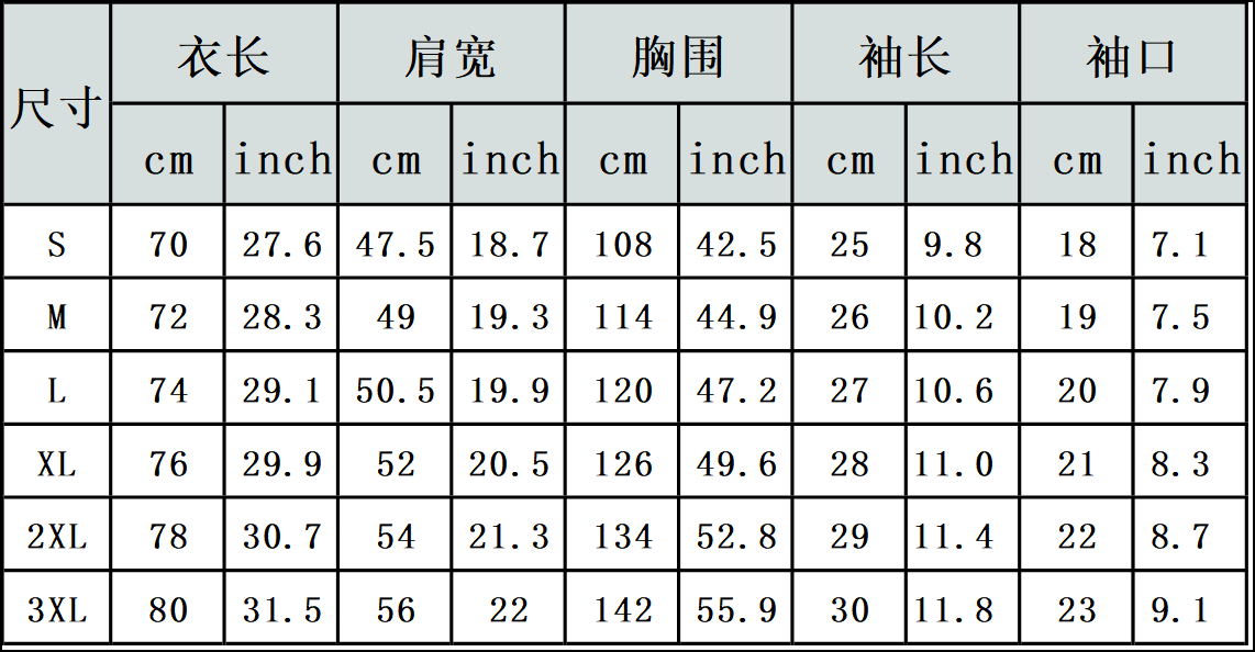 【特别说明】此尺码数据在衣服平铺下测量所得,因测量方法不同,误差在1-3cm内的属于正常现象