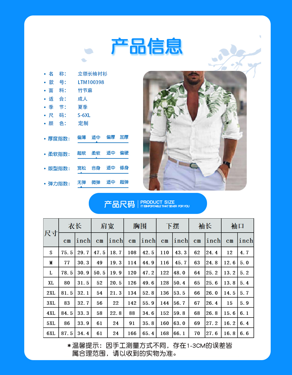 中文名称:立领长袖衬衫英文名称:产品货号:LTM100398生产工艺: 满印印花产品材质: 涤纶(Polyester)