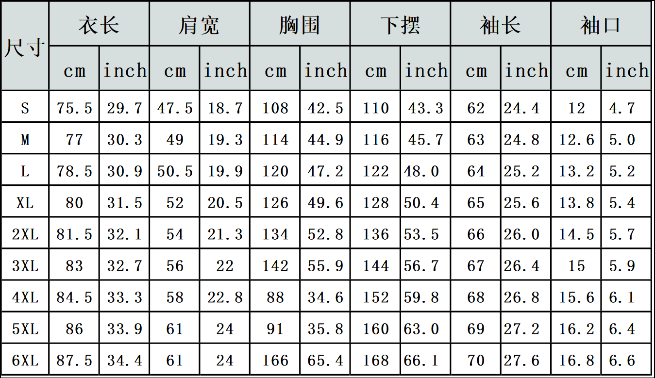 【特别说明】此尺码数据在衣服平铺下测量所得,因测量方法不同,误差在1-3cm内的属于正常现象