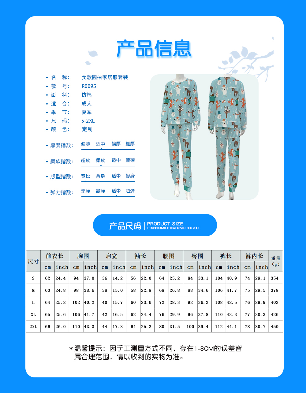 中文名称:女款圆袖家居服套装英文名称:产品货号:R0095生产工艺: 满印印花产品材质: 仿棉