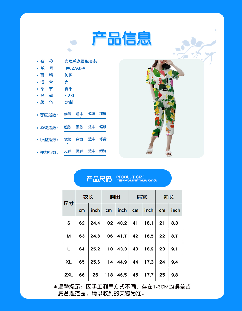 中文名称:女短款家居服-衣服英文名称:Short short home service产品货号:R0027AB-A生产工艺: 满印印花产品材质: 仿棉