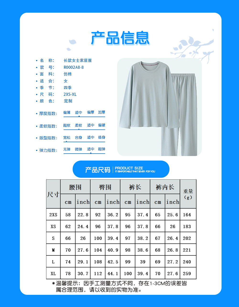 【适用场景】适合居家,适合春季、夏季和秋季穿着。