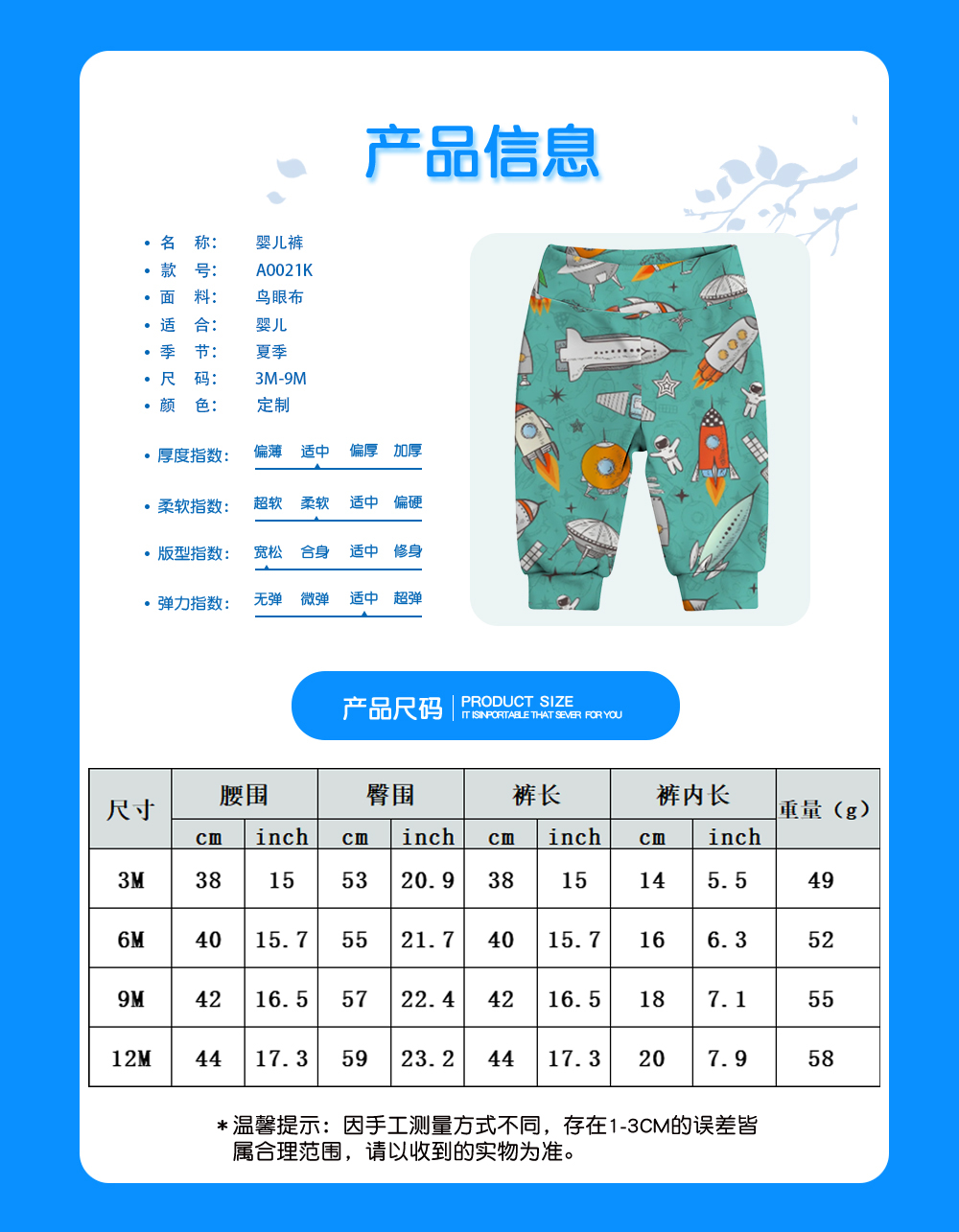 中文名称:婴儿裤英文名称:产品货号:A0021K生产工艺:满印印花产品材质:鸟眼布