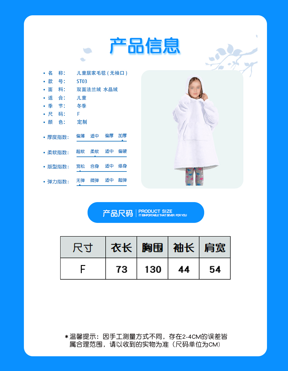 中文名称:儿童居家毛毯英文名称:产品货号:ST03生产工艺: 满印印花产品材质: 涤纶(Polyester)