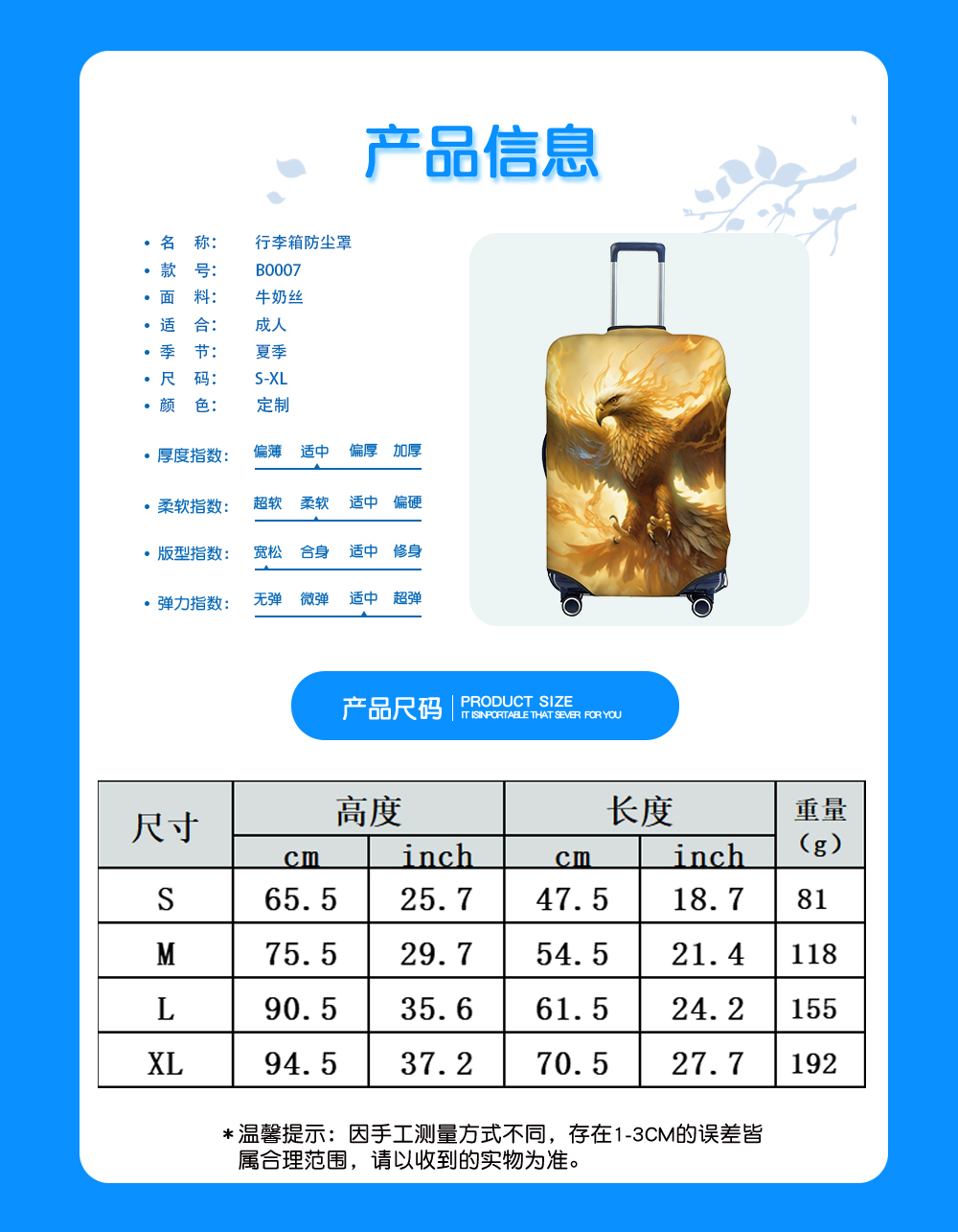 中文名称:行李箱防尘罩英文名称:产品货号:B0007生产工艺: 满印印花产品材质:牛奶丝