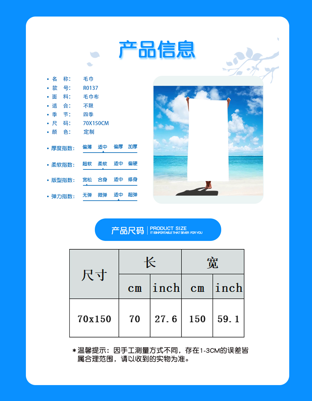 中文名称: 毛巾70x150CM英文名称:产品编号:R0137生产工艺: 满印印花产品材质:毛巾布