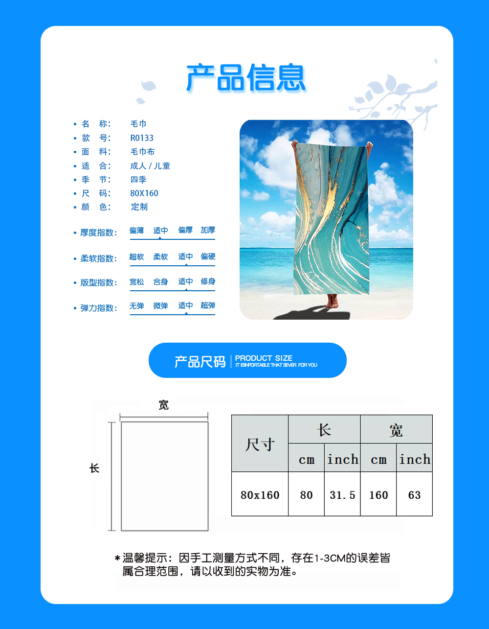 中文名称: 毛巾80X160cm英文名称:产品编号:R0133生产工艺: 满印印花产品材质:毛巾布
