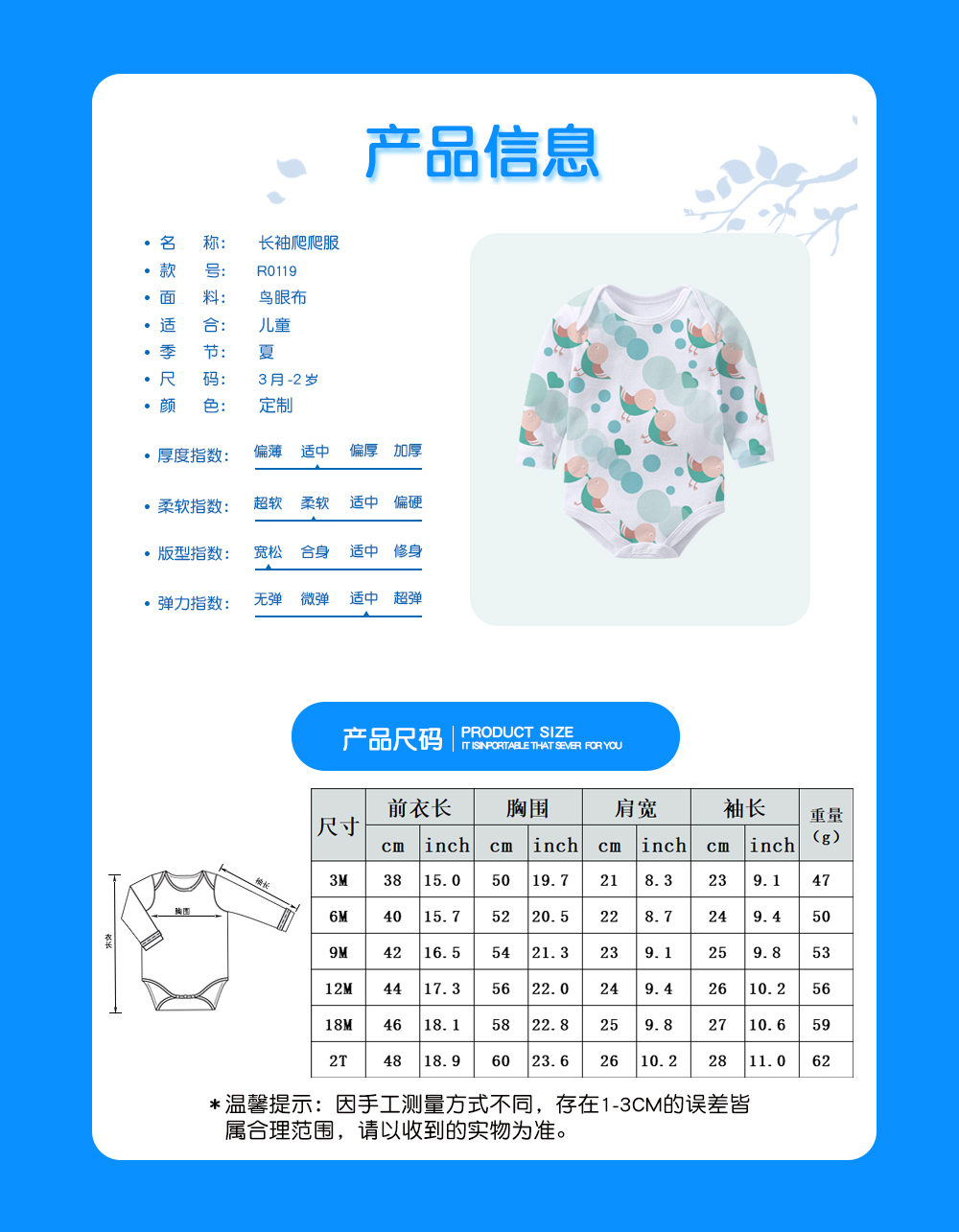 中文名称:长袖爬爬服包边英文名称:Long sleeve climbing suit产品货号:R0119生产工艺:满印印花产品材质: 涤纶(Polyester)