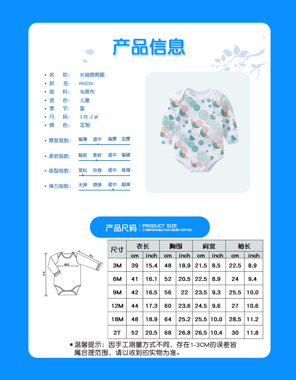 中文名称:长袖爬爬服英文名称:Long sleeve climbing suit产品货号:R0030生产工艺:满印印花产品材质: 鸟眼布