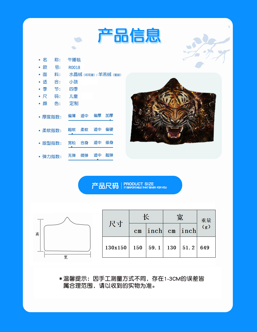 中文名称: 午睡毯水晶绒130x150cm英文名称: A nap blanket产品编号:R0018生产工艺: 满印印花产品材质:水晶绒