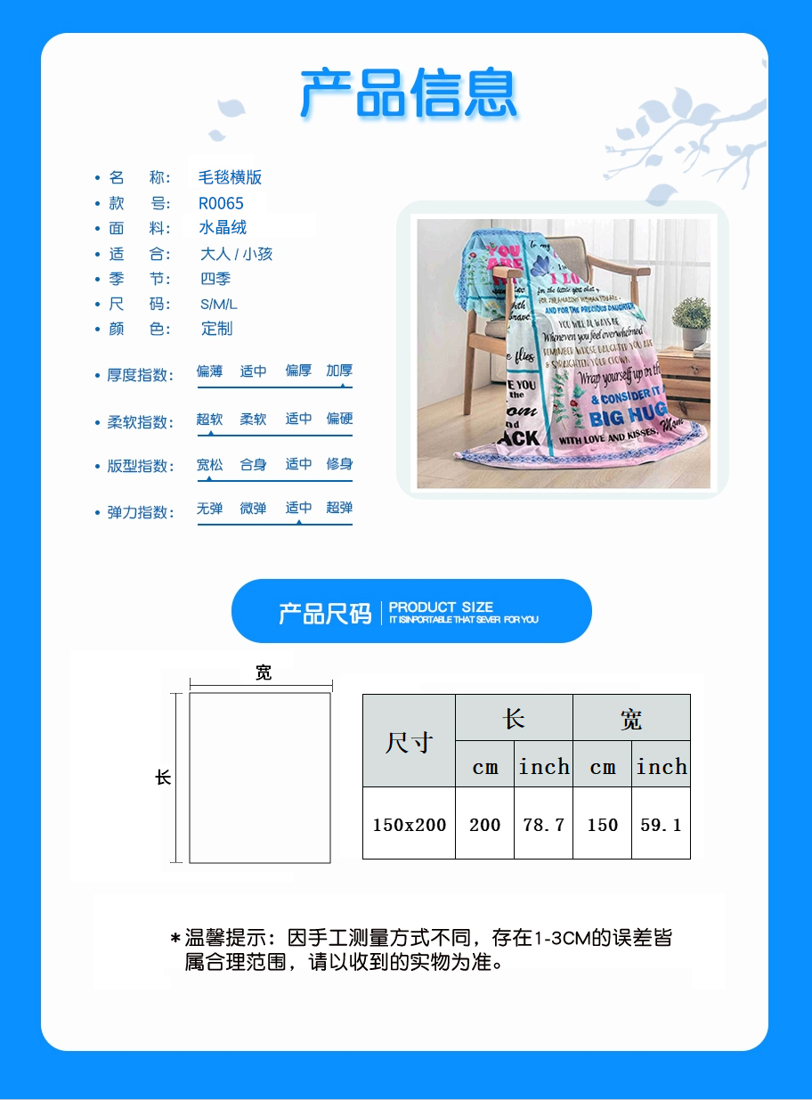 中文名称: 3D 毛毯竖版水晶绒150X200cm英文名称: blanket产品编号:R0065生产工艺: 满印印花产品材质:水晶绒