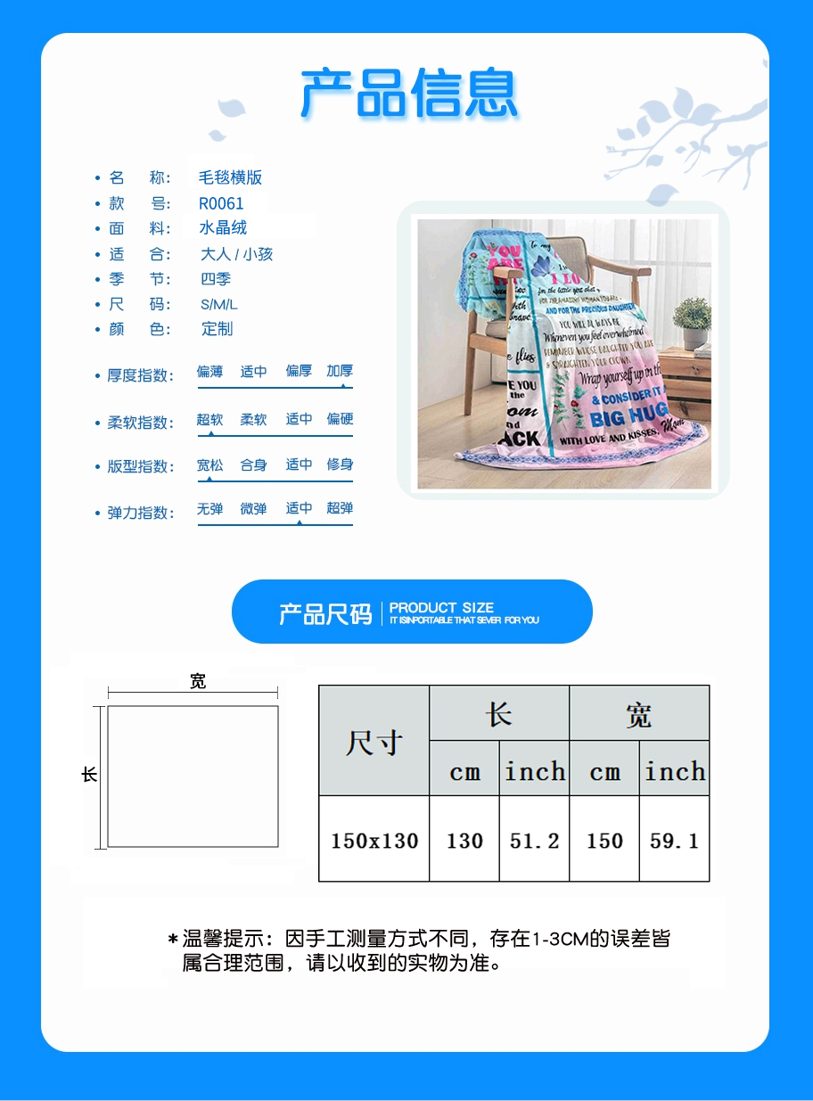 中文名称: 3D 毛毯横版水晶绒150X130cm英文名称: blanket产品编号:R0061生产工艺: 满印印花产品材质:水晶绒
