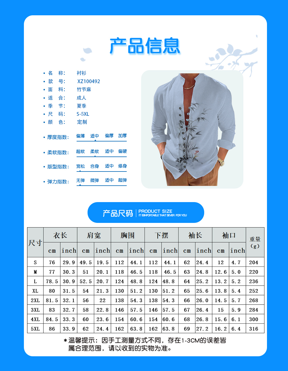 【特别说明】此尺码数据在衣服平铺下测量所得,因测量方法不同,误差在1-3cm内的属于正常现象