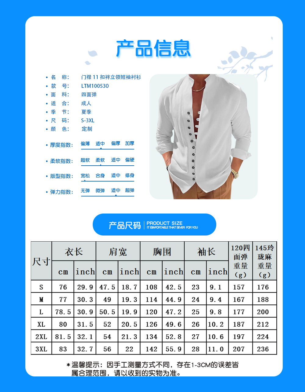 中文名称:11扣袢立领短袖衬衫英文名称:产品货号:LTM100530生产工艺: 满印印花产品材质: 四面弹