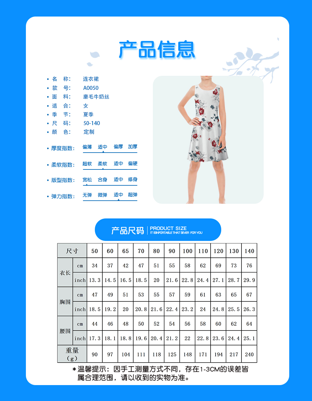 中文名称: 连衣裙英文名称: 产品编号:A0050生产工艺: 满印印花产品材质: 磨毛牛奶丝