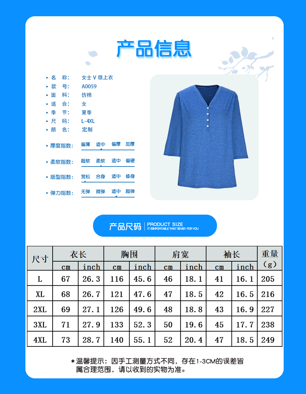 中文名称:女士V领上衣英文名称:产品货号:A0059生产工艺: 满印印花产品材质: 仿棉