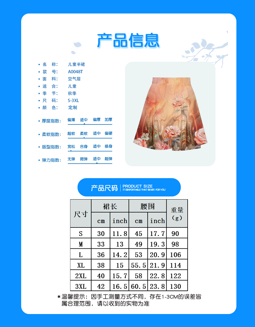 中文名称: 儿童半裙英文名称: 产品编号:A0048T生产工艺: 满印印花产品材质:空气层